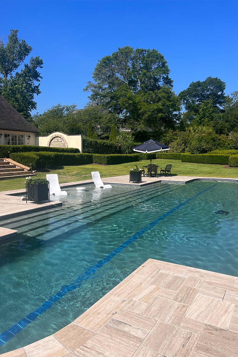 The pool is 60×40 to allow for laps and to fit the large yard. The layout allows for seamless transitions between lounging, dining, and conversation, with a wrought-iron dining set under a navy umbrella to the left and a chic, resort-style seating arrangement positioned beyond the water’s edge. The outdoor furniture is styled in crisp whites and deep navies, accented by striped pillows and framed by large planters overflowing with blooms tying together a palette that feels clean, coastal, and classic.