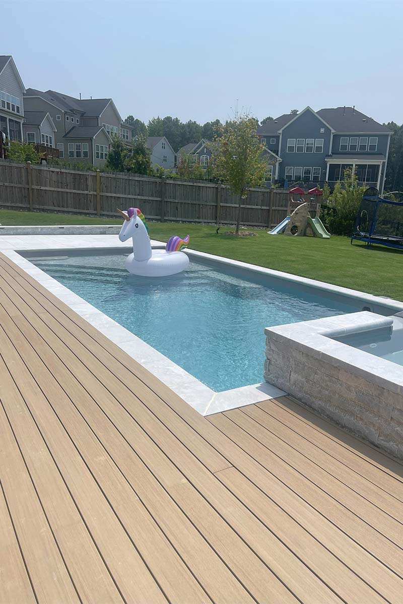 This stunning backyard retreat showcases the Aspen fiberglass pool and spa a sleek and spacious pairing designed for effortless enjoyment and visual harmony with a curved lounging ledge and subtle benches. Wrapped in a serene Afyon Cloud marble and TimberTec Composite Wood Decking, the entire hardscape is laid in a running bond pattern, offering just enough texture to guide the eye without overpowering the clean geometry.