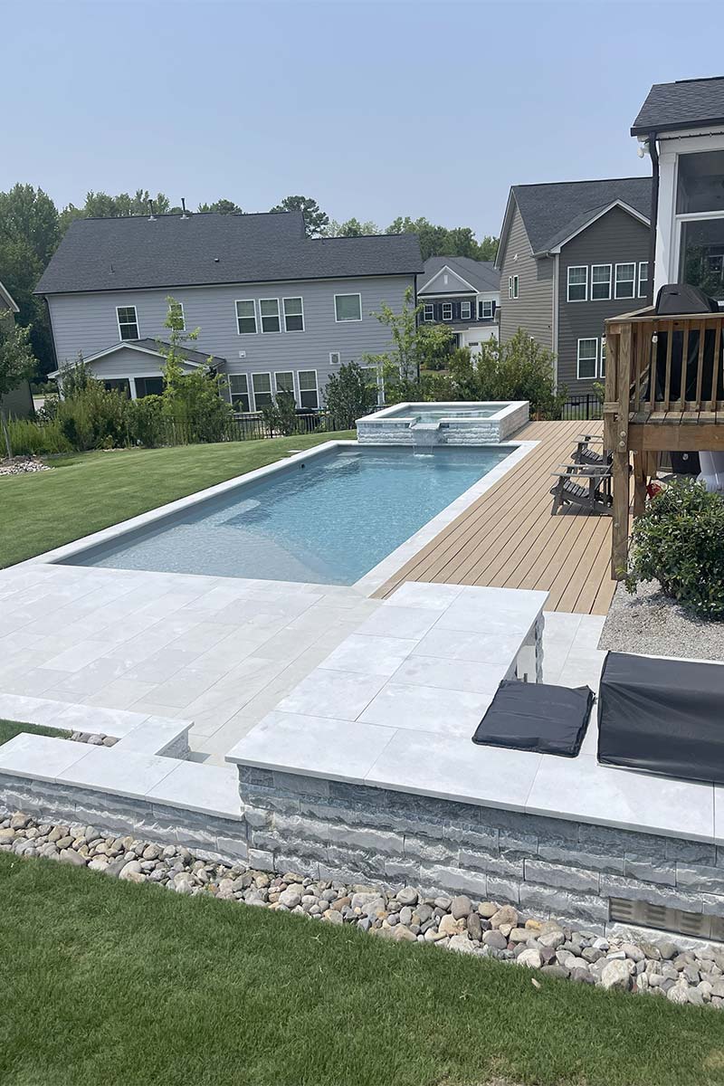 The outdoor kitchen is thoughtfully veneered in matching Afyon Cloud, tying the material palette together with seamless consistency and elevating the overall aesthetic. Adjacent to the pool, a warm TimberTech composite deck offers a low-maintenance lounging area that contrasts beautifully against the cool-toned marble while adding an organic warmth to the space.