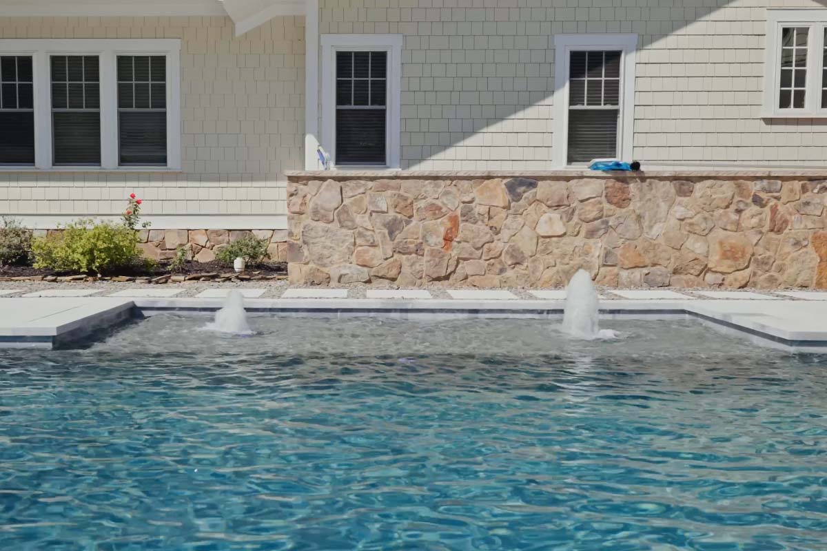 Tucked just off the fairways of Pinehurst’s world-famous golf course, this custom pool is a clean representation of modern elegance. Framed in Afyon Cloud sand-blasted marble pavers, and Marble Slab walkways in natural river stone the space offers a soft, luminous palette that perfectly complements the deep, refreshing tones of the Tahoe Blue PebbleTec interior finish.